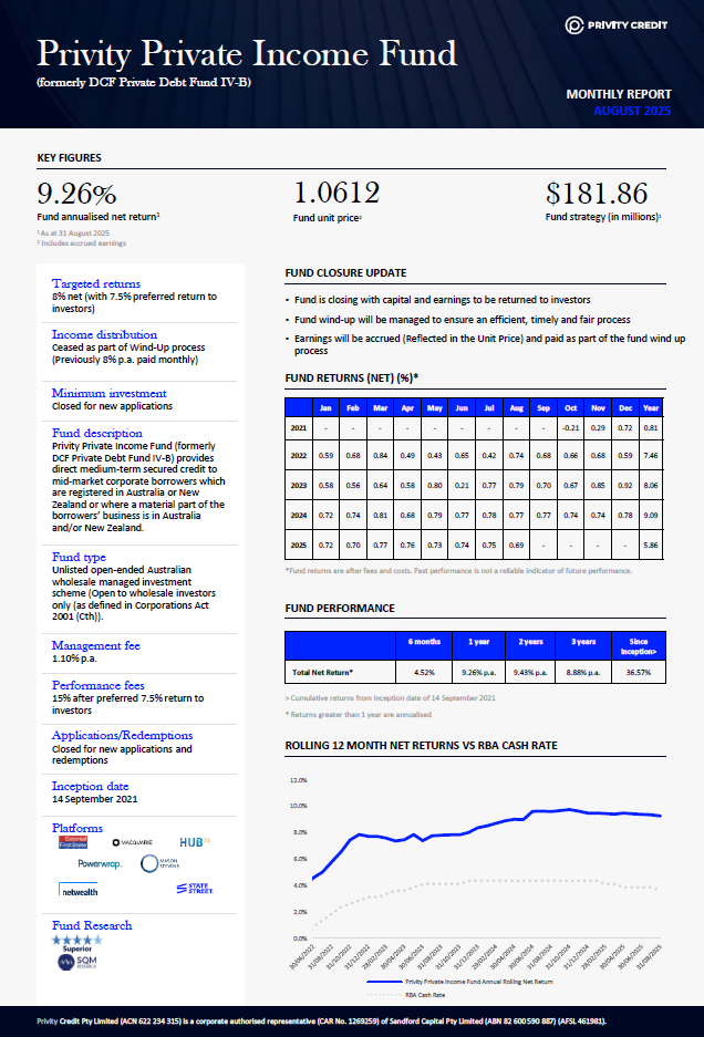 The Privity Private Income Fund (formerly DCF Private Debt Fund IV-B Class A Units) (the “Fund”) is an unlisted, open-ended Australian-managed investment scheme that is not currently registered with ASIC, offering investors an opportunity to gain access to the corporate credit market.